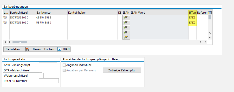 Bei der Auswahl der EmpfĂ€ngerbank wird zur Laufzeit des Zahllaufs im Regelfall die Bankverbindung (FK02) der ersten Position im Stammsatz des GeschĂ€ftspartners verwendet. Mit Hilfe des Felds "BTyp" kann zur Bank ein eigenes Kennzeichen festgelegt werden, welches ĂŒber den Beleg die spĂ€tere EmpfĂ€ngerbank steuert.