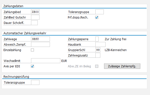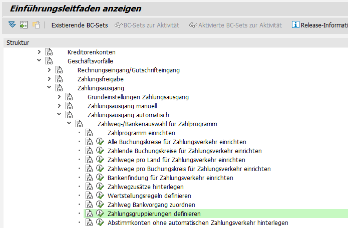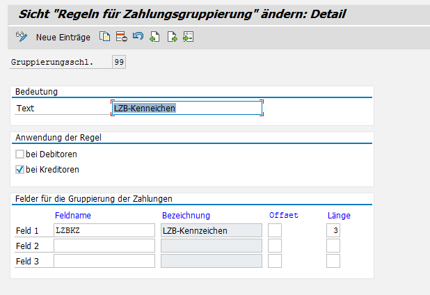 Mit Hilfe der Zahlungsgruppierung können Schlüssel definiert werden, mit denen offene Posten von Debitoren- oder Kreditorenkonten für eine Zahlung gruppiert werden können. Dazu werden in dem Gruppierungsschlüssel maximal drei Felder des offenen Posten definiert. Für die spätere, gemeinsame Regulierung müssen deren Inhalten übereinstimmen damit diese gemeinsam bezahlt werden können.
