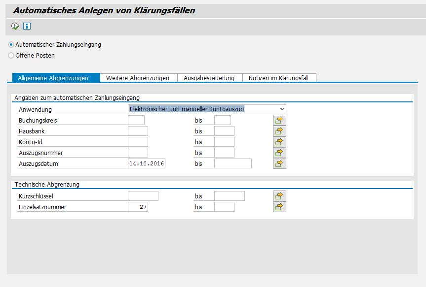 27. Dezember 2016 um 11:21 Offizieller Beitrag #1 Mit Hilfe des Reports RFDM3000 können automatisch Klärungsfälle aus dem automatischen Zahlungseingang angelegt werden.
