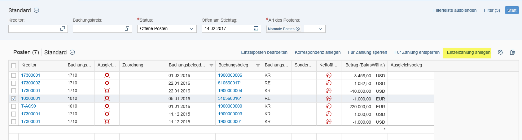 Mit einem direkten Rechnungsbezug wird über die App "Kreditorenposten bearbeiten" die Rechnung selektiert die bezahlt werden soll: