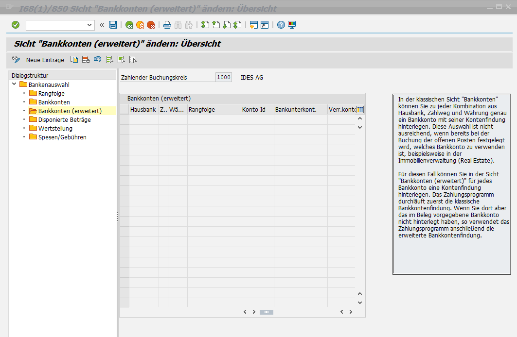 Mit der erweiterten Kontenfindung (Transaktion FBZP) wird das Szenario zur Spezifikation des Hausbankkontos in den offenen Posten definiert. Im Standard unterstützte die Funktion keine Rangfolgen mehrerer Konten derselben Hausbank.