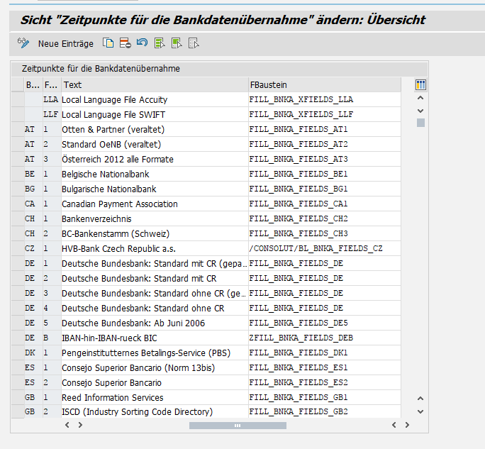 Über die Transaktion BA01 werden die Funktionsbausteine hinterlegt, mit denen die landesspezifischen Formate zur Übernahme des Bankenstamm verarbeitet werden.