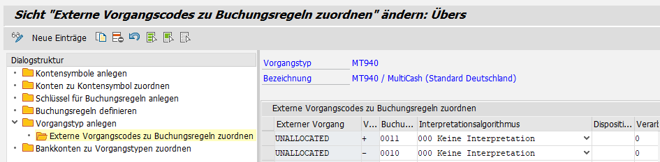 Damit die elektronischen KontoauszĂŒge auch bei fehlenden GVC verarbeitet werden, kann in der Zuordnung der GVC zur Buchungsregel der SchlĂŒssel "UNALLOCATED" angelegt werden.