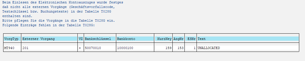 Wenn die Bank einen GeschĂ€ftsvorfallcode (GVC) verwendet, der noch nicht im SAP angelegt ist, werden die KontoauszĂŒge nicht automatisch verarbeitet. Der GVC muss zunĂ€chst nachgepflegt werden, und kann in einem weiteren Schritt nochmals eingelesen werden.