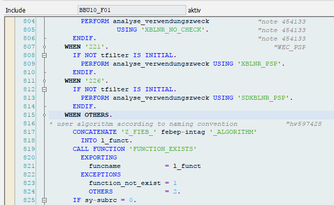 10. Dezember 2017 um 17:52 Offizieller Beitrag #1 Neben dem User-Exit kann auch bspw. ein kundeneigener Interpretationsalgorithmus für die Belegfindung verwendet werden. der Aufruf dazu erfolgt im Include BBU10_F01 des RFEBBU10 (Bspw. Z_FIEB_901_ALGORITHM).