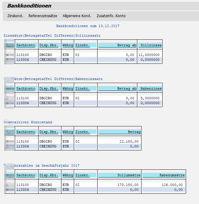 13. Dezember 2017 um 18:08 Offizieller Beitrag #1 Der Report RFFDUZ00 listet zu einem Stichtag die Zinskonditionen, den dispositiven Kontenstand und die Sachkontenverkehrszahlen fĂŒr zwei Bankkonten an.