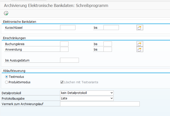 Die Ermittlung der Objekte erfolgt über die Transaktion SARA. Über den Report FI_ELBANK_WRI werden die ausgewählten Kontoauszüge archiviert (Voraussetzung - Konfiguriertes Archivsystem).