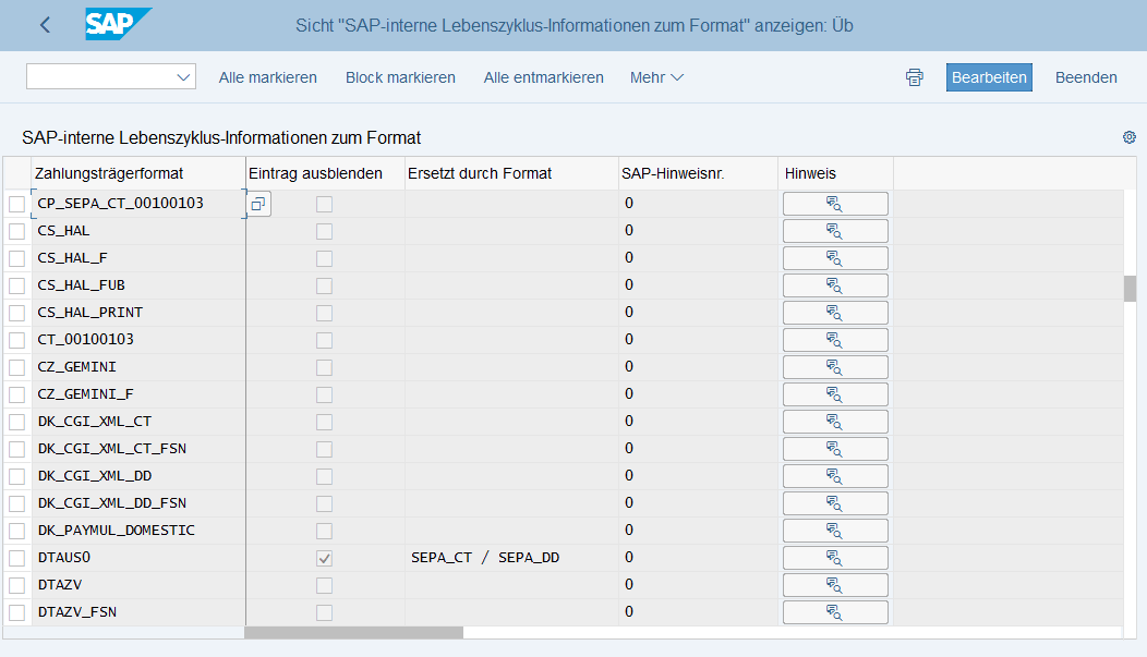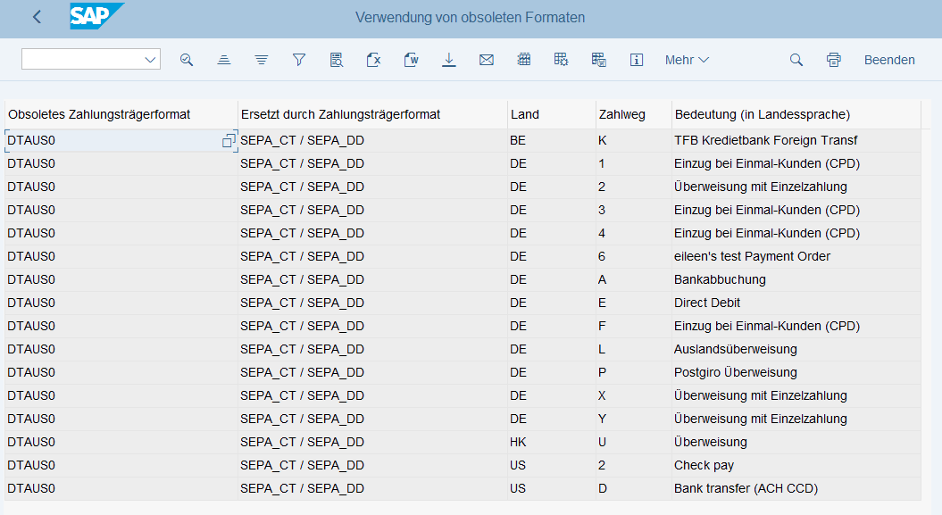 24. August 2018 um 06:47 Offizieller Beitrag #1 Mit dem Hinweis 2668719 - OBPM1 - Attribute zum Lebenszyklus von Zahlungsträgerformaten werden zwei neue Transaktionen ausgeliefert:OBPM1SA undOBPM1S_LIST die über den Lebenszyklus von Zahlungsträgerformaten in der OBPM1 informieren.