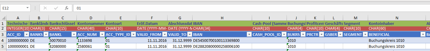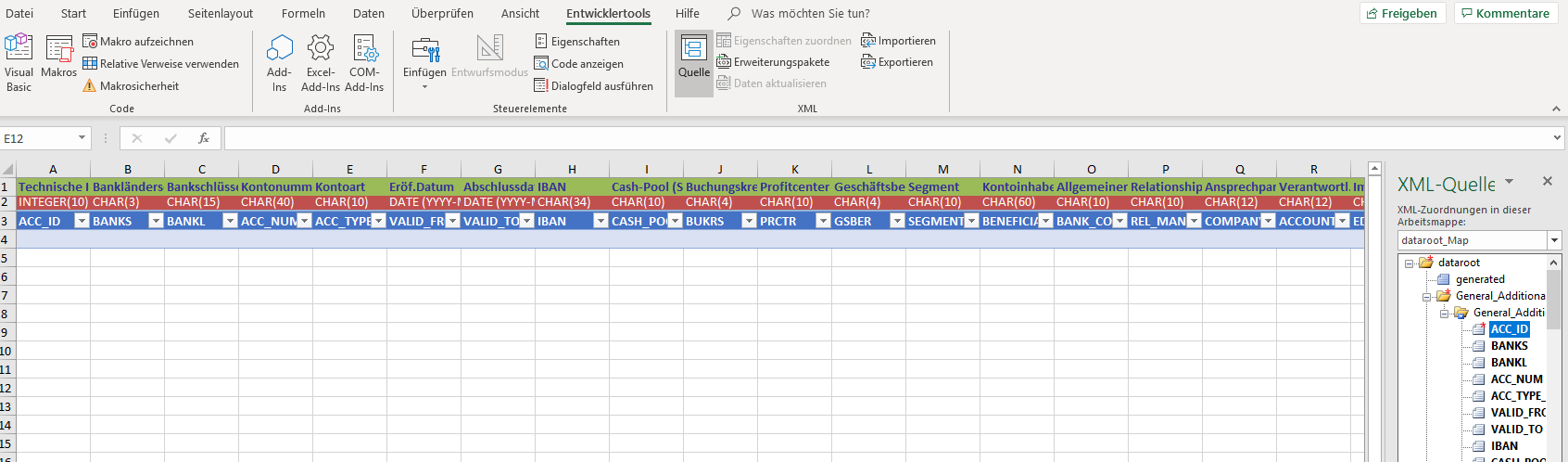 Im nĂ€chsten Schritt wird ĂŒber „Importieren“ die Bank_Accounts.xml eingefĂŒgt und kann in Excel bearbeitet werden: