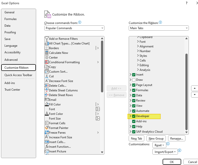 Wichtig fĂŒr den Import an der Stelle ist: In den Optionen von Excel muss das Entwicklertool eingeblendet werden: