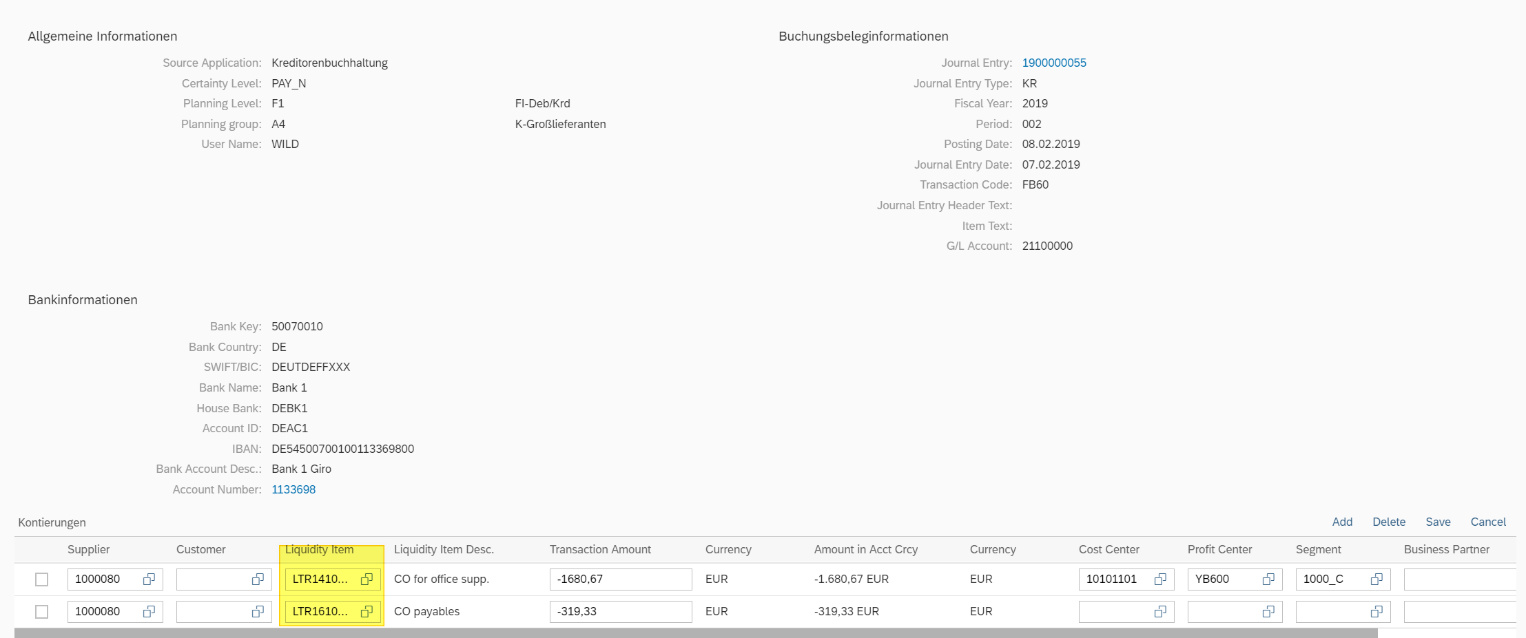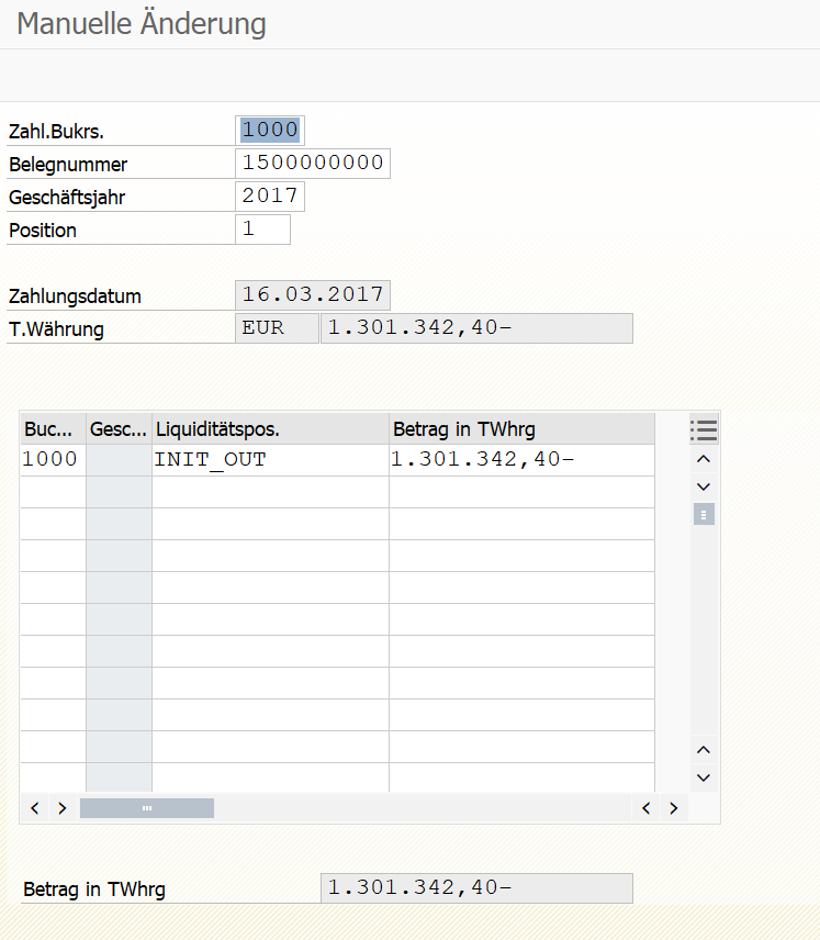 Im Änderungsmodus einer Belegposition kann die Liquiditätsposition nachträglich geändert werden: