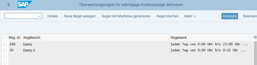 24. Februar 2019 um 18:15 Offizieller Beitrag #1 Mit Hilfe des Reports FCLM_BRM_GENERATE_RULE werden die untertägigen Kontoauszüge (SWIFT MT942 oder CAMT.052) überwacht und können über die App Kontoauszugsmonitor - Untertägig geprüft werden.