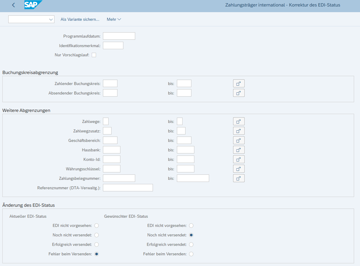 6. Juli 2019 um 13:58 Offizieller Beitrag #1 Treten bei der Erstellung eines EDI-Zahlungsträgers (IDoc) bspw. Fehler auf, kann der Status eines EDI-Zahlungsträgers geändert bzw. zurückgesetzt werden.