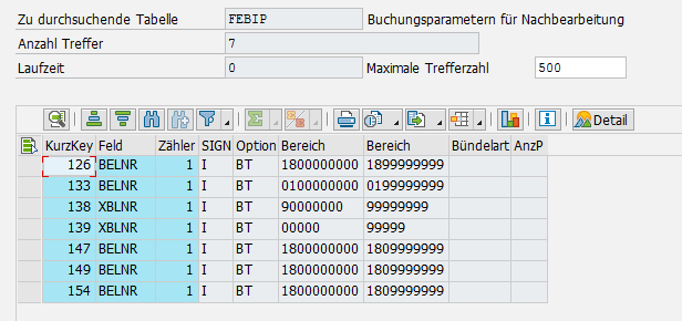 Beim Import des Kontoauszuges werden die Intervalle aus der Selektion (RFEBKA00) in der Tabelle FEPIP gespeichert. Für die erneute Interpretation wird geprüft ob ein Eintrag in der FEBIP vorliegt. Wenn keine Intervalle ermittelt werden können besteht optional die Möglichkeit einen Nummernkreis in den Einstellungen für den Datenimport zu hinterlegen.