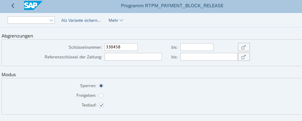 Mit Hilfe des Reports RTPM_PAYMENT_BLOCK_RELEASE können Zahlungsanordnungen gesperrt oder freigegeben werden.