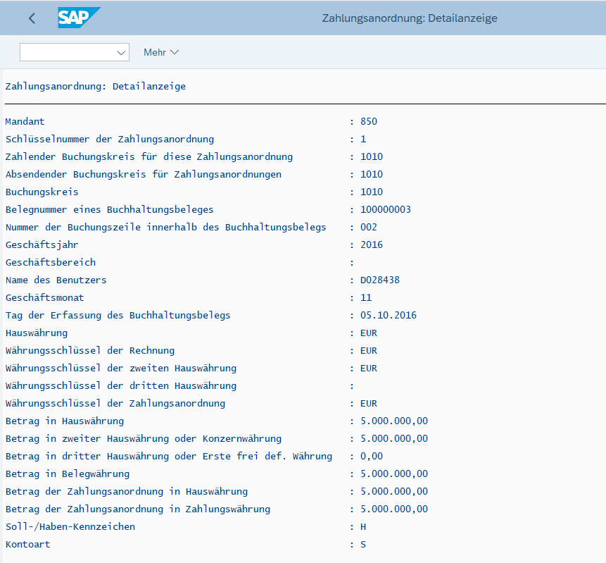 7. Dezember 2019 um 13:35 Offizieller Beitrag #1 Mit Hilfe der Transaktion F8BS kann die Detailanzeige einer Zahlungsanordnung aufgerufen werden.