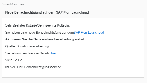 Hier kann eine bestimmte Gruppe von Benutzern darüber informiert werden wenn die Aktivierung der Bankkontenüberarbeitung seit einer bestimmten Anzahl an Tagen noch aussteht - Hausbankkonto in Zahlungskonfiguration prüfen
