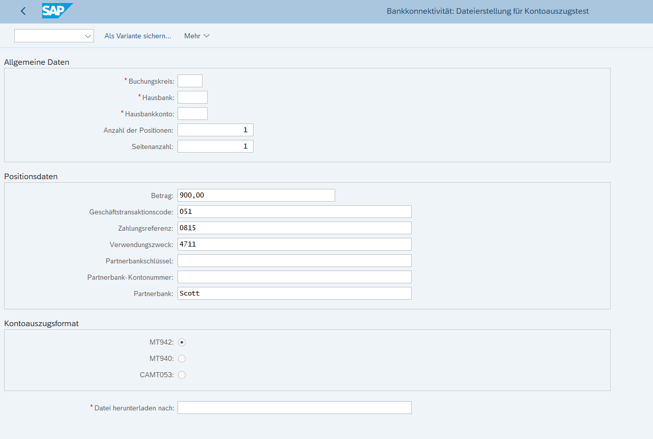 Über den Report R_FSCM_FSN_TEST_MASS_BS können Testkontoauszüge im Format SWIFT MT940 & 942 sowie CAMT.053 erstellt werden.