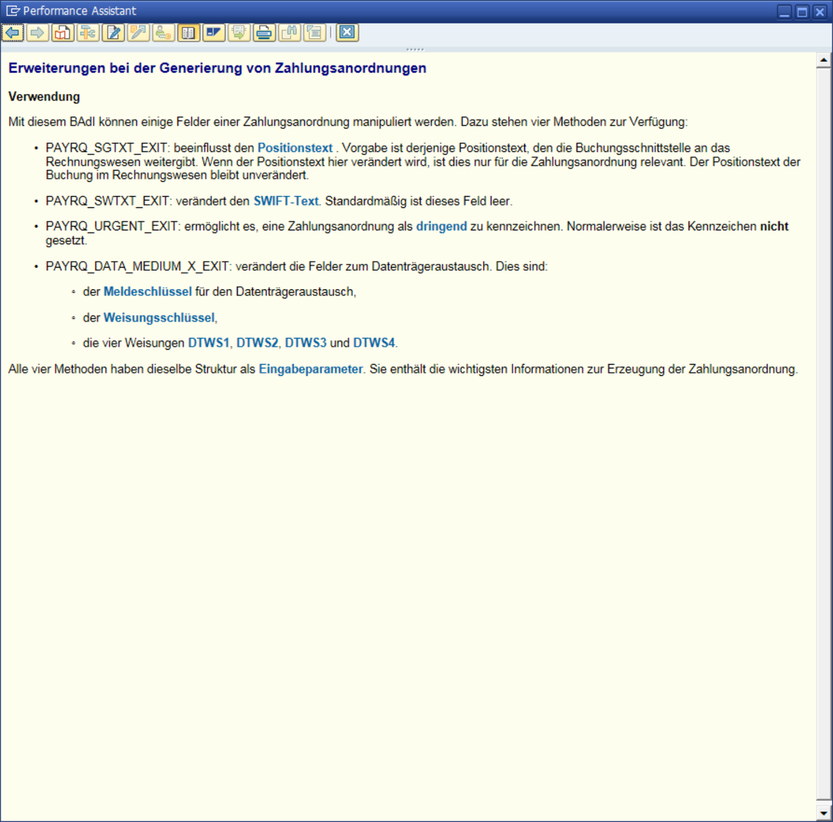 Kennt jemand von euch eine Möglichkeit wie man den Weisungsschlüssel aus Treasury in die FI Zahlungsanordnung übergeben kann? Ich habe im Standard bisher keine funktionierende Möglichkeit gefunden. Das einzige was ich gefunden habe ist das BADI PAYRQ_DATA_MEDIUM_X_EXIT in dem man den Weisungsschlüssel beeinflussen kann.