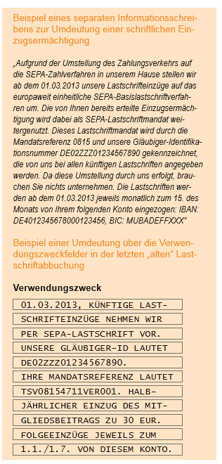 Einen interessanten Lösungsansatz für eine schnelle und einfache Umdeutung wurde nun in der aktuellen "Checkliste zur SEPA-Einführung" vom eBusiness-Lotsen Ostbayern veröffentlicht. Darin enthalten ist der Vorschlag die notwendigen Informationen über den letzten alten Lastschrifteinzug mitzuteilen: