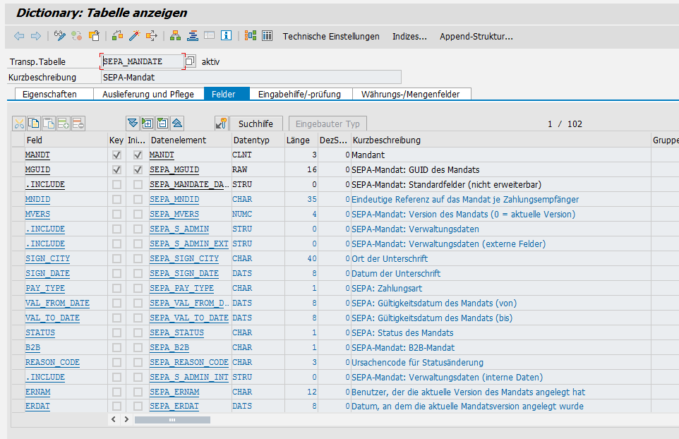 In SAP können die dazu notwendigen Felder aus der Tabelle SEPA_MANDATE entnommen werden: