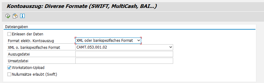Mit dem Hinweis 1686264 ist nun auch die Verarbeitung der CAMT-KontoauszĂŒge in SAP möglich. ErgĂ€nzt wird die FunktionalitĂ€t durch ein XSLT (CGI) aus dem Hinweis 1729745.