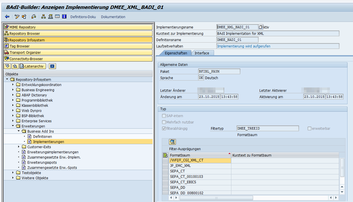 Jeder zusätzliche Formatbaum der vom SAP-Standard abweicht muss implementiert werden. Dazu ist es notwendig den Baum dem Implementierungsnamen DMEE_XML_BADI_01 zuzuordnen.