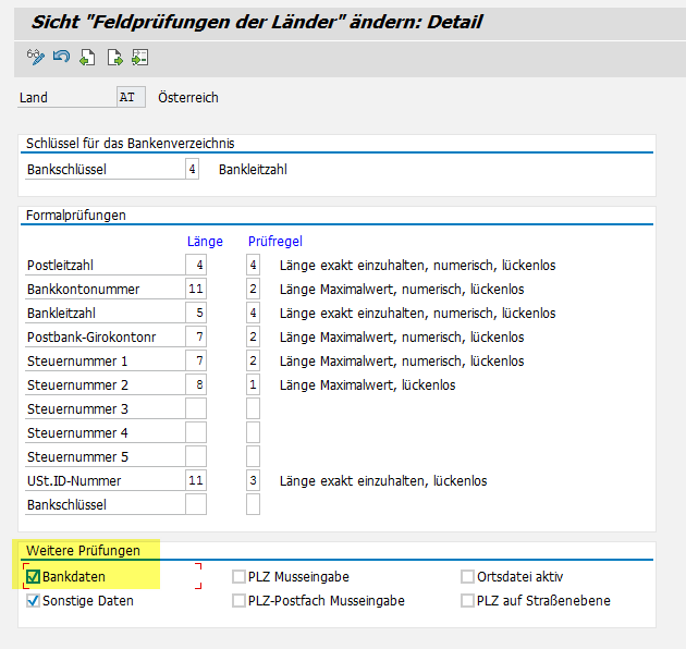 Über die Feldprüfung der Länder (Transaktion OY17) kann die landesspezifsche Prüfung der Bankdaten festgelegt werden. Mit dem Feld "Bankdaten" wird die korrekte Angabe des BIC geprüft. Entspricht die Länge des BICs nicht den Vorgaben von SWIFT erfolgt eine Fehlermeldung.