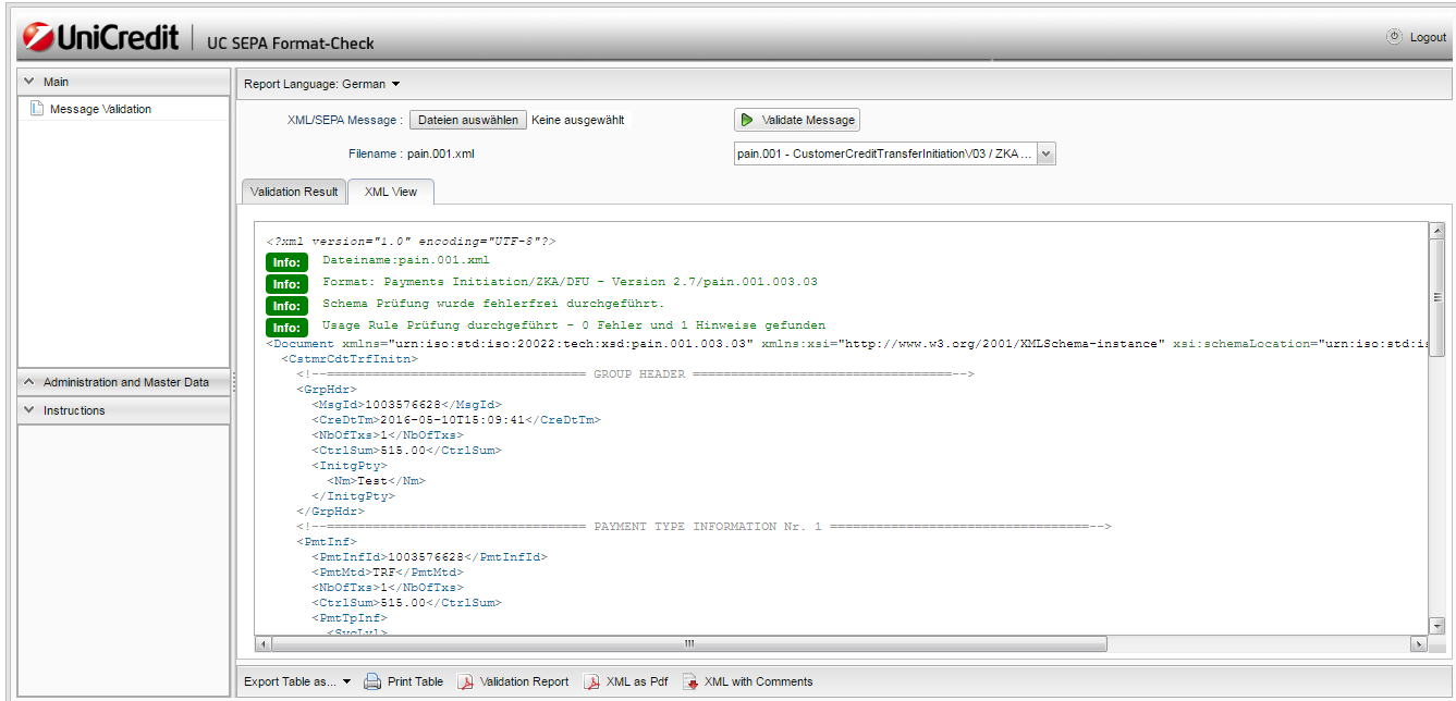 8. Februar 2014 um 15:25 Offizieller Beitrag #1 Kunden der UniCredit haben die Möglichkeit die SEPA-Nachrichten (SCT, SDD) mit dem UC SEPA Format-Check gegen das aktuelle DK-Schema zu validieren:https://payfits.unicredit.eu/payfitsvp/