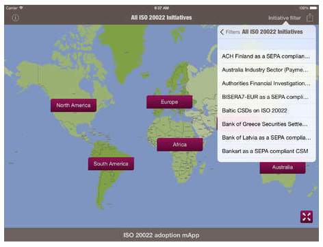 SWIFT Standards veröffentlichte bereits 2013 eine App, mit der aktuelle ISO 20022 Initiativen in unterschiedlichen LĂ€ndern sowie in den zustĂ€ndigen Gruppen verfolgt werden können. Die App fĂŒr IOS ist im App Store von Apple kostenlos erhĂ€ltlich.