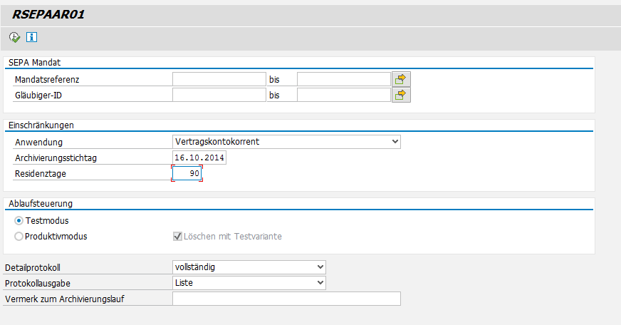 21. August 2014 um 16:06 Offizieller Beitrag #1 ber den Report RSEPAAR01 bzw. RSEPAAR02 können SEPA-Mandate archiviert werden. Mit dem Hinweis 2015973 wurde der Report RSEPAAR01 um Residenztage für die Archivierung erweitert.RSEPAAR02 RSEPAAR01