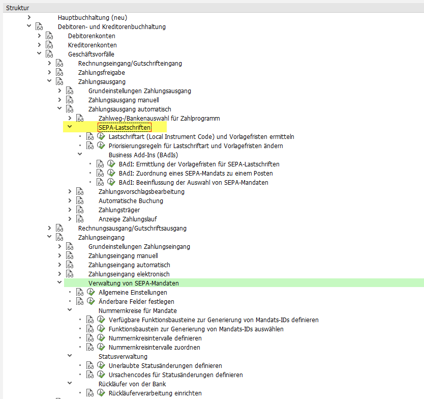 Die SEPA-Mandatsverwaltung wurde mit SAP EhP7 neu strukturiert bzw. zugeordnet (siehe Dateianhang). Detaillierte Informationen finden Sie auch im "Praxishandbuch SAP und SEPA".