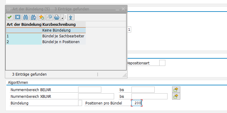 Bei der Bündelart 1 wird das Feld mit dem Sachbearbeiterkürzel aus den Debitoren- Kreditorenstammdaten gefüllt. Bei der Bündelart 2 wird aus n-Posten ein Bündel gebildet (maximal 99 Bündel). Darüber hinaus kann über den Userexit eine eigene Bündelung der Belege programmiert werden.