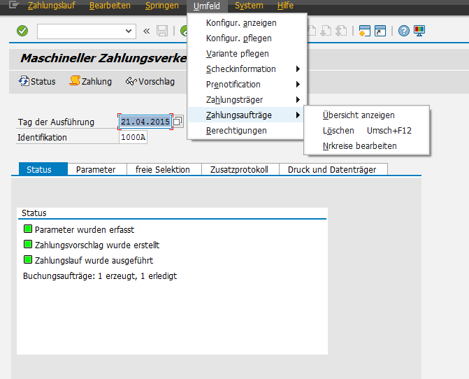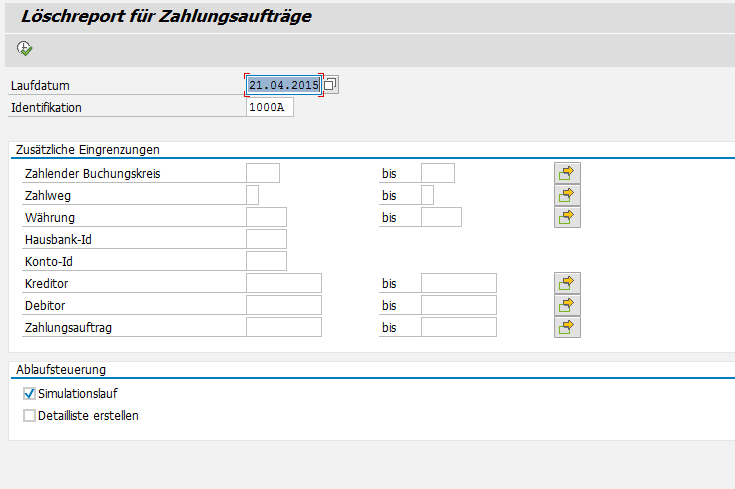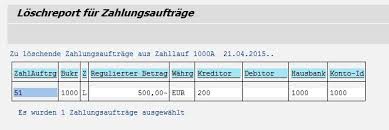 21. April 2015 um 16:58 Offizieller Beitrag #1 Der Zahlungsauftrag kann direkt im Zahllauf (F110) angezeigt und gelöscht werden. Löschreport für Zahlungsaufträge RFPYORDD Eine Übersicht der Belege die über Zahlungsaufträge reguliert worden sind kann über den Report RFPYORD_LD aufgerufen werden.