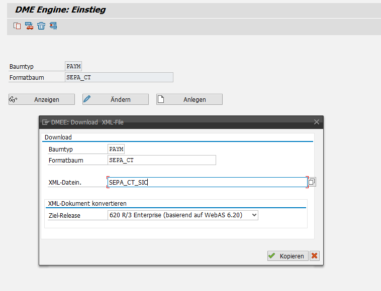 Die DatentrĂ€gerformate in der PMW werden im Namensraum der SAP verwaltet. Ănderungen sollten an der Stelle weitgehend vermieden werden! Somit werden bei einem Releasewechsel die eigenen Einstellungen in den DatentrĂ€gerformaten ĂŒberschrieben. Mit der Funktion "XML-Datei schreiben" kann der aktive XML-Baum ĂŒbernommen werden. Dabei wird das XML-Dokument in das "Ziel-Release 620 R/3 Enterprise" konvertiert.
