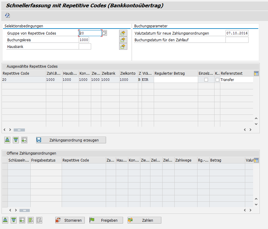 Schnellerfassung von Zahlungen mit Repetetive Code über die Transaktion FRFT (Beispiel Bankkontenübertrag):