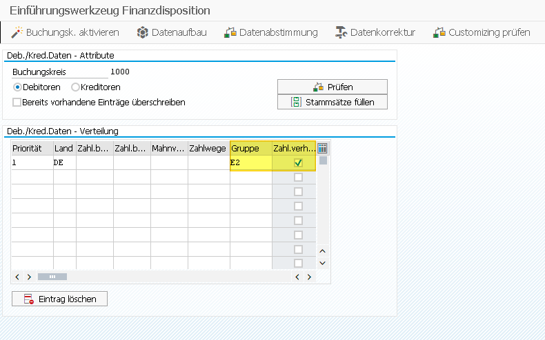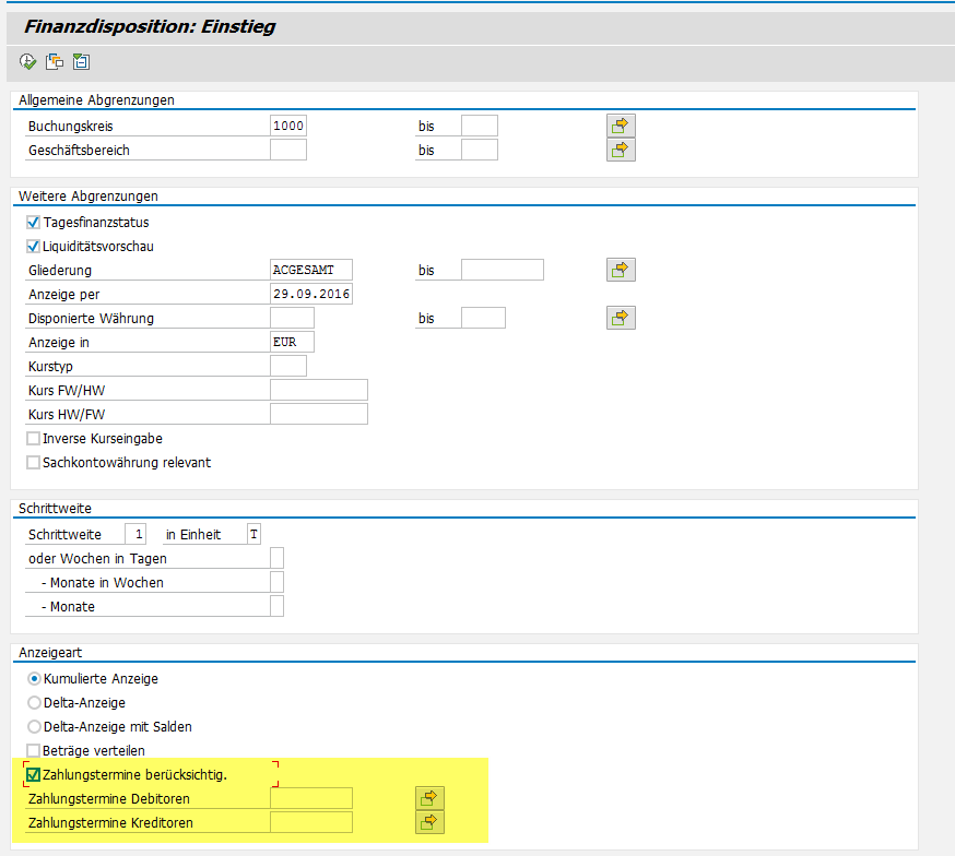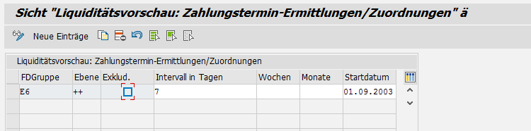 Im Customizing des Cash Management kann definiert werden, fĂŒr welche Finanzdispogruppen bzw. Ebenen die voraussichtlichen Zahlungstermine ermittelt werden sollen. FĂŒr die darin definierten Gruppen werden die BetrĂ€ge nicht mehr am Dispositionsdatum, sondern am dazugehörigen Zahlungstermin angezeigt (Transaktion OT85).