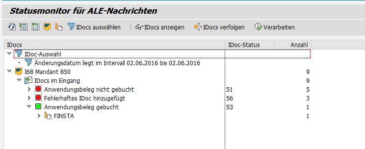 Im Anschluss wird das IDoc korrekt verarbeitet (Testkennzeichen in der Partnervereinbarung) und dargestellt: