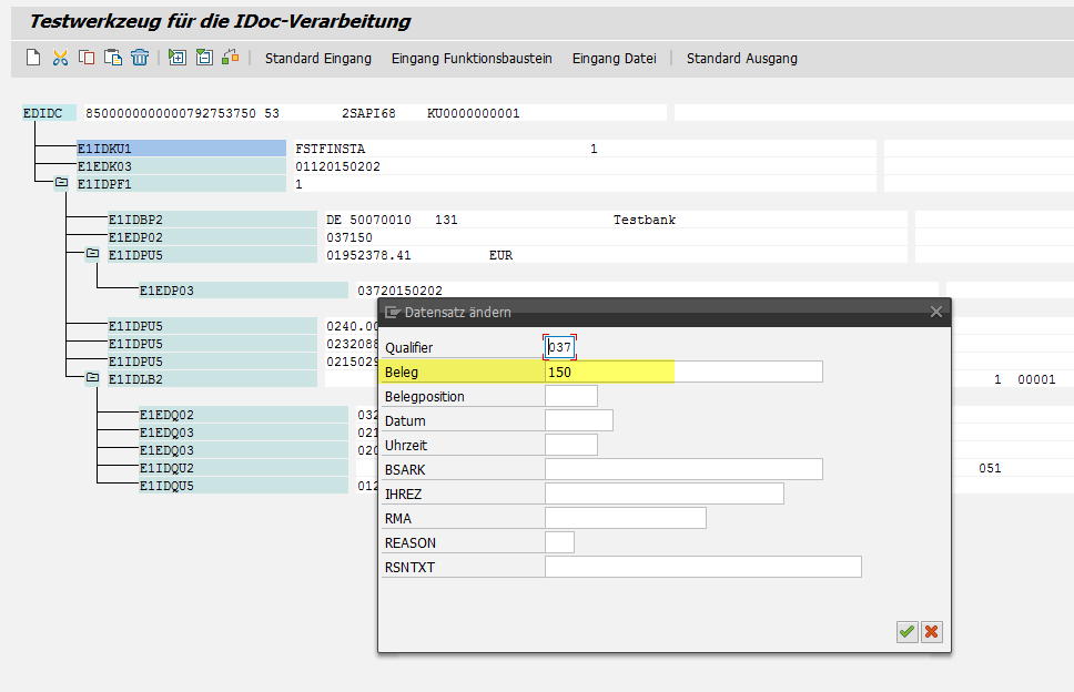 Da das IDoc auf Basis eines bestehenden Kontoauszugs erstellt wird, muss das IDoc vor der Verbuchung mit Hilfe der Transaktion WE19 zunächst (Auszugsnummer) editiert werden: