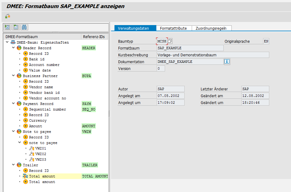 Für die Konvertierung wird in der DMEE der Baumtyp MCSH verwendet. Als Vorlage wird der Formatbaum SAP_EXAMPLE
