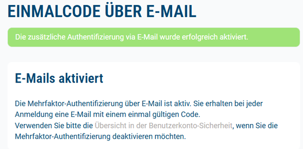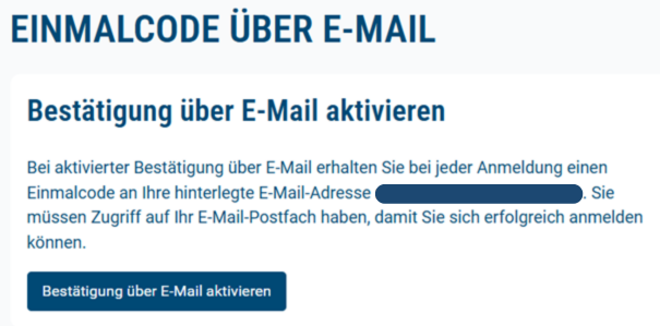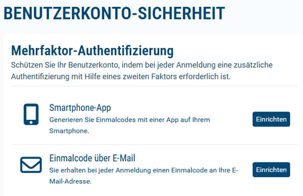 Nun haben Sie die Möglichkeit, eine zusätzliche Authentifizierung per Smartphone-App und/oder durch einen Einmalcode per Mail einzurichten.