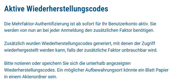 Im Anschluss an die Einrichtung einer der oben genannten Authentifizierungsmethoden erhalten Sie automatisch 10 Wiederherstellungscodes. Diese können Sie für Ihre Anmeldung verwenden, sollte die Anmeldung per Smartphone oder Einmalcode per E-Mail einmal nicht funktionieren.